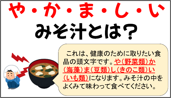 「やかましいみそ汁」とは、みそ汁がうるさいわけではありません。これは、健康のために取りたい食品の頭文字です。