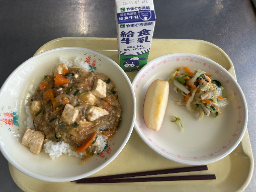 ~マーボー春雨丼 ちんげんさいの中華あえ りんご 牛乳~