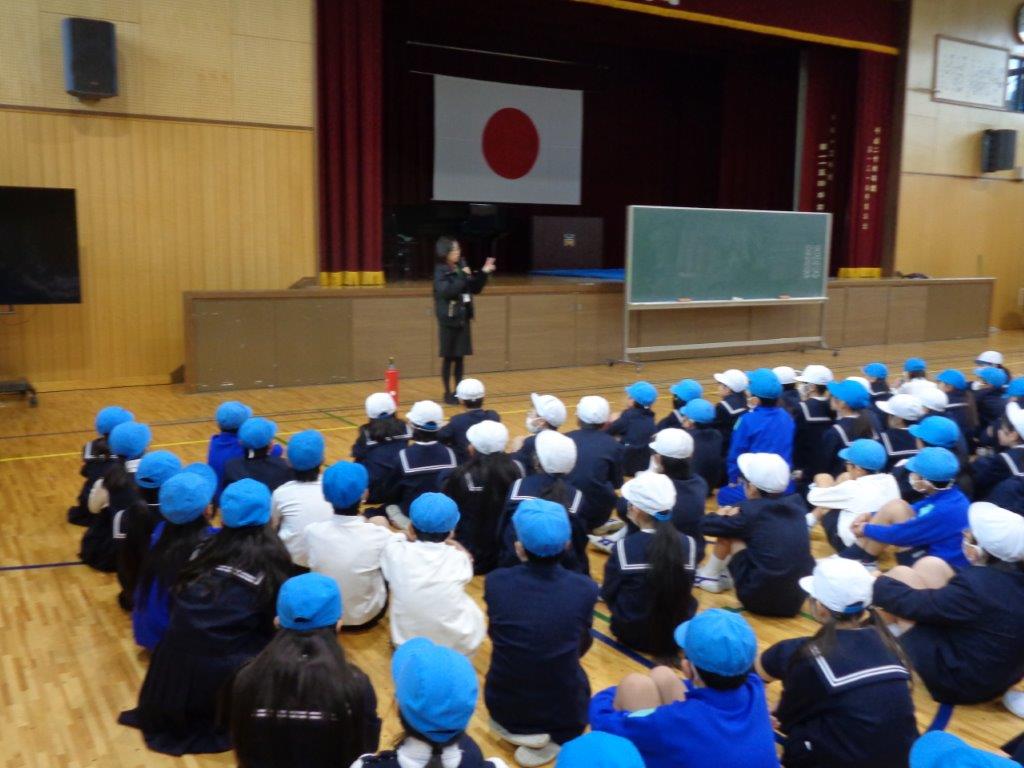 地震の音とともに緊急放送が流れると,子どもたちは静かに机の下に入り,頭を守る姿勢をとりました。その後,地震に続けて火災報知器の音が鳴ると,落ち着いて次の指示を待ち,体育館へ速やかに避難することができました。